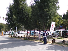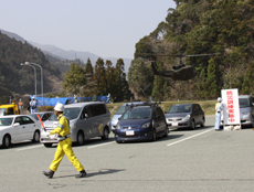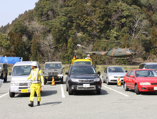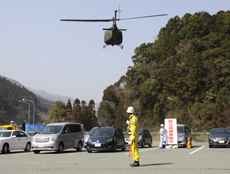 実際に自衛隊ヘリコプターの離発着が行われる中、一般車両の誘導警備に従事しました。