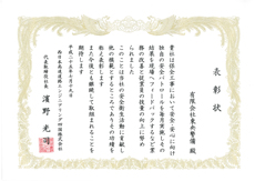 安全パトロールの毎月実施により安全衛生活動に寄与した功労者として感謝状を授与されました。