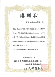 高速道路の早期交通確保に貢献した功労者として感謝状を授与されました。