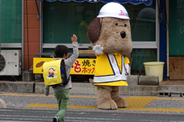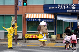 横断歩道を渡る小学生に大人気のとうおうくん。