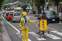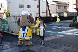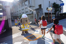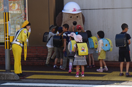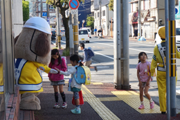 学校の校長先生とお話して、通学路の指定の場所にて児童の交通安全活動を行ってます。