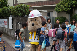 通学する児童のみんなと校門前で握手するとうおうくん。