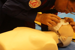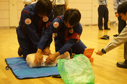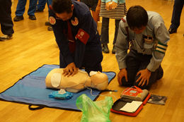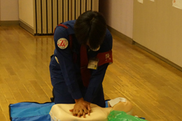 会場ではたくさんの受講者とともに、人工呼吸や心臓マッサージの救命措置に加え、