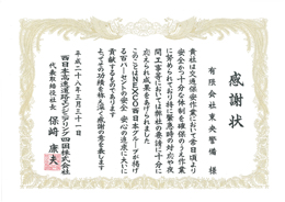 NEXCO西日本グループが掲げる百パーセントの安全安心の追求に大いに貢献したことを称えていただき、