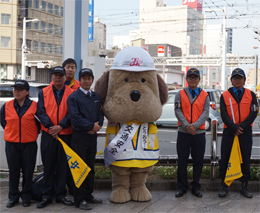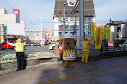 朝の通勤通学時で行き交うたくさんの方々に交通安全を呼びかけ、