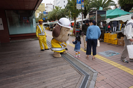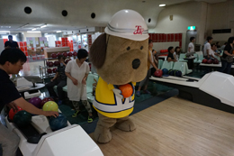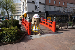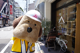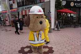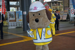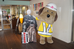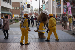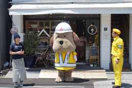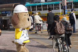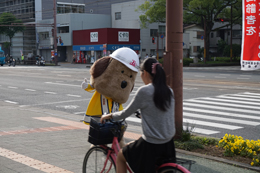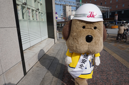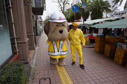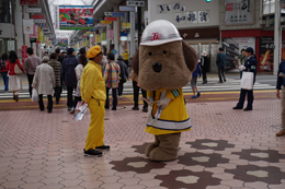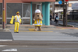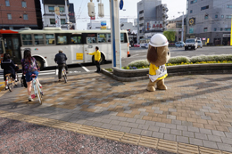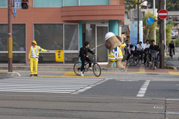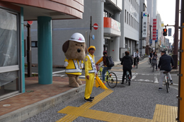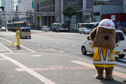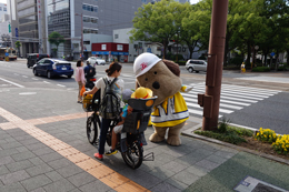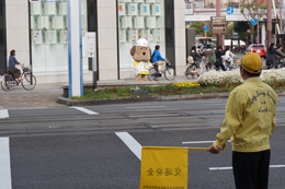帯屋町二丁目に到着し、啓発活動に勤しむとうおうくん。