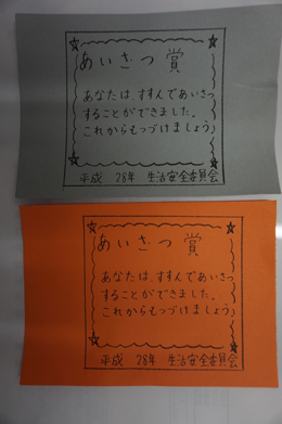 横内小学校では、あいさつ賞を配る活動をされており、