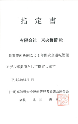 一般社団法人 高知県安全運転管理者協議会連合会より指定書を賜りました。