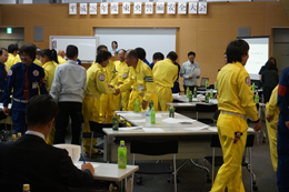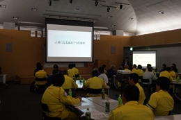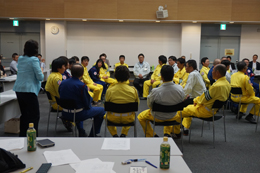 汗をかきながら他の部署と共同で行う笑顔のたえないコミュニケーションの講習会、