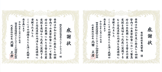 このたび、当社とグループ会社の株式会社全日本エンタープライズライズが、西日本高速道路エンジニアリング四国株式会社より感謝状を授与されました。