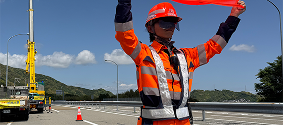 当グループは高速道路の交通誘導業務に従事する社員の安全を最優先に、バイザー付きヘルメットを導入しました。