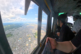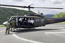 視察では駐屯地施設の見学に加え、自衛隊のヘリコプターに搭乗して高知上空を飛行し、南海トラフ地震の震源域となる太平洋沿岸や高知市内の津波浸水エリア、災害時の重要なライフラインである「命の道」高知東部自動車道を上空から確認しました。