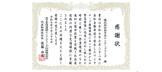 令和7年10月27日、西日本高速道路エンジニアリング四国株式会社様より、当グループ会社の株式会社全日本エンタープライズに対して感謝状が授与されました。高知自動車道で発生した事故において、緊急要請に迅速に対応し、適切な復旧作業を実施したことで、高速道路の円滑な交通確保に貢献したことを評価いただきました。